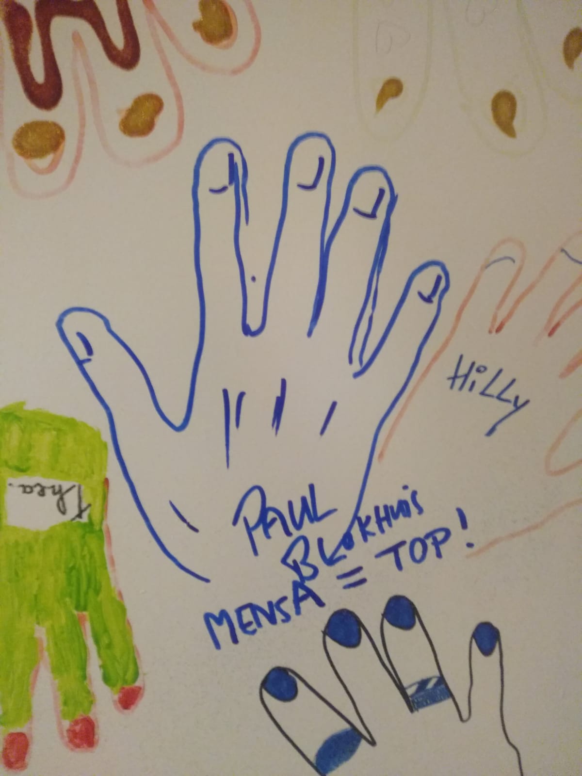 Aan de muur hangen borden met allemaal handomtrekken daarop getekend. Minette, een van de vaste medewerkers, gaf aan dat de handen symboliseren dat men met elkaar de schouders eronder zet en elkaar weer op weg helpt. Daar zetten Paul Blokhuis en lijsttrekker Tjisse Stelpstra graag hun (letterlijke) handtekening onder!